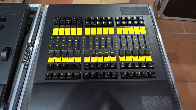 - Command Wing: Bàn khiển chính với các nút chức năng, núm xoay và cần điều khiển master. Mặt sau có các cổng kết nối và out DMX giúp kết nối với đèn dễ dàng. Các phím trên command fader wing là phím cơ, có độ nảy cao,nhạy và có đèn nền hiệu ứng cực đẹp.