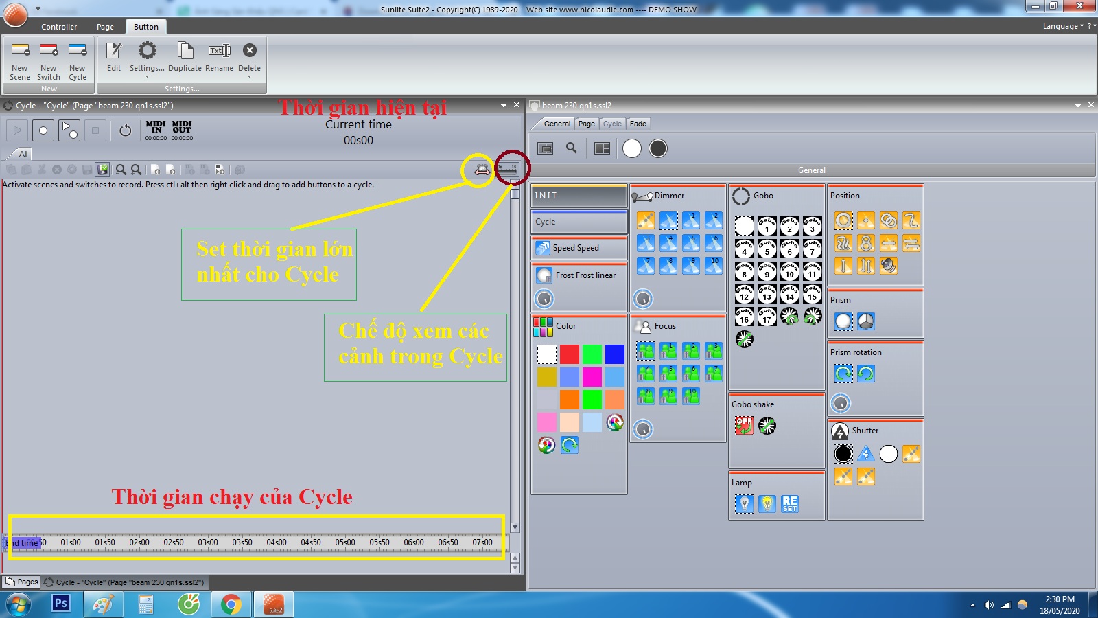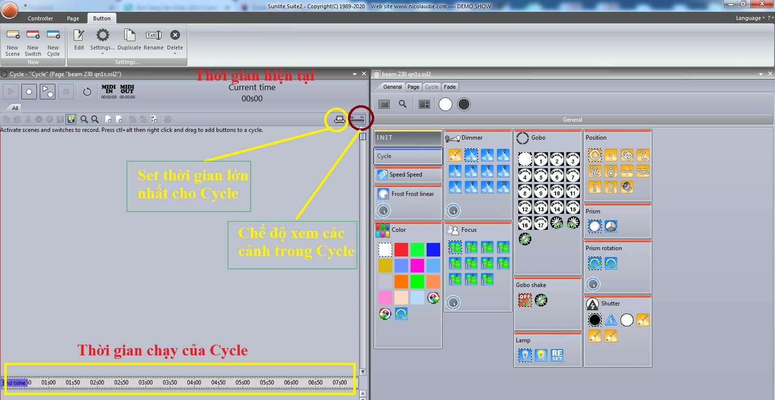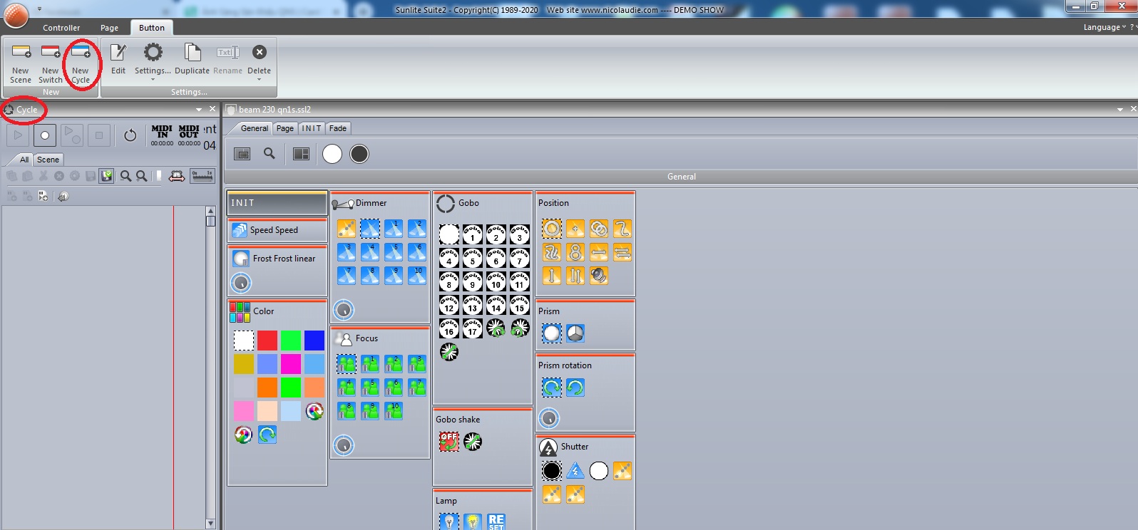 Đầu tiên, ta cần lựa Cycle trên giao diện phần mềm. Ở đây mình dùng giao diện sunlite suite 2. Với giao diện 1, các bạn cũng làm tương tự. Vào Button, lựa chọn Cycle. Bảng giao diện Cycle sẽ hiện ra trên giao diện điều khiển đèn.