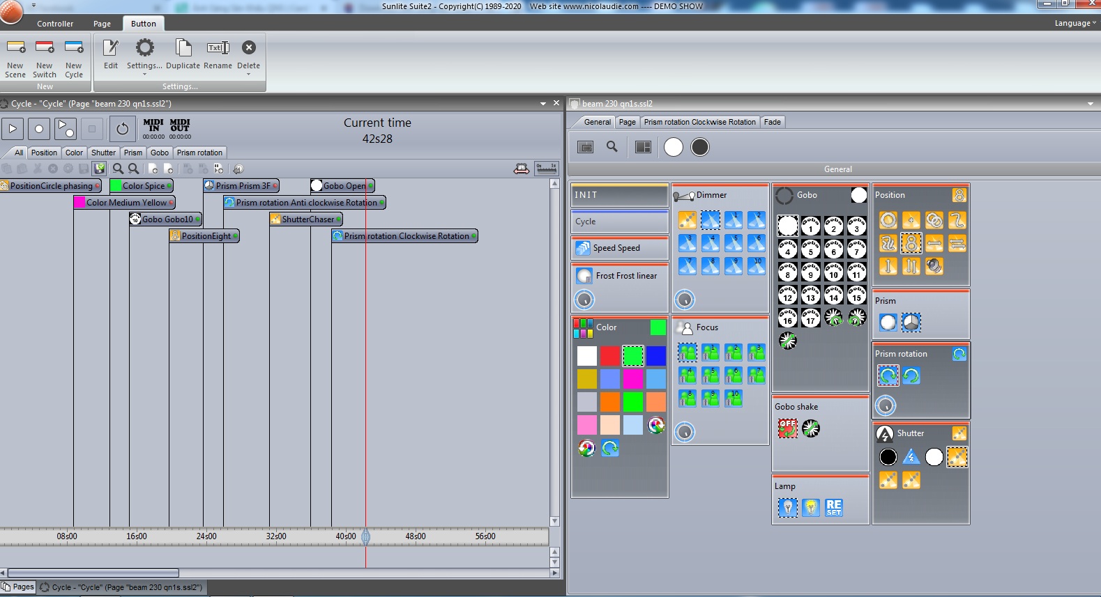 Các bạn có thể nhìn thử vào ảnh bên trên, trong đó mình đã gán thử các tính năng vào trong Cycle của sunlite 2. Đầu tiên là cảnh (sense) chạy của đèn, sau đó khoảng 10s mình gán màu tím, 13s là màu xanh và 15s là Gobo. Tiếp đó là chuyển cảnh, nhân hoa rồi đổi gobo, chớp đuổi...