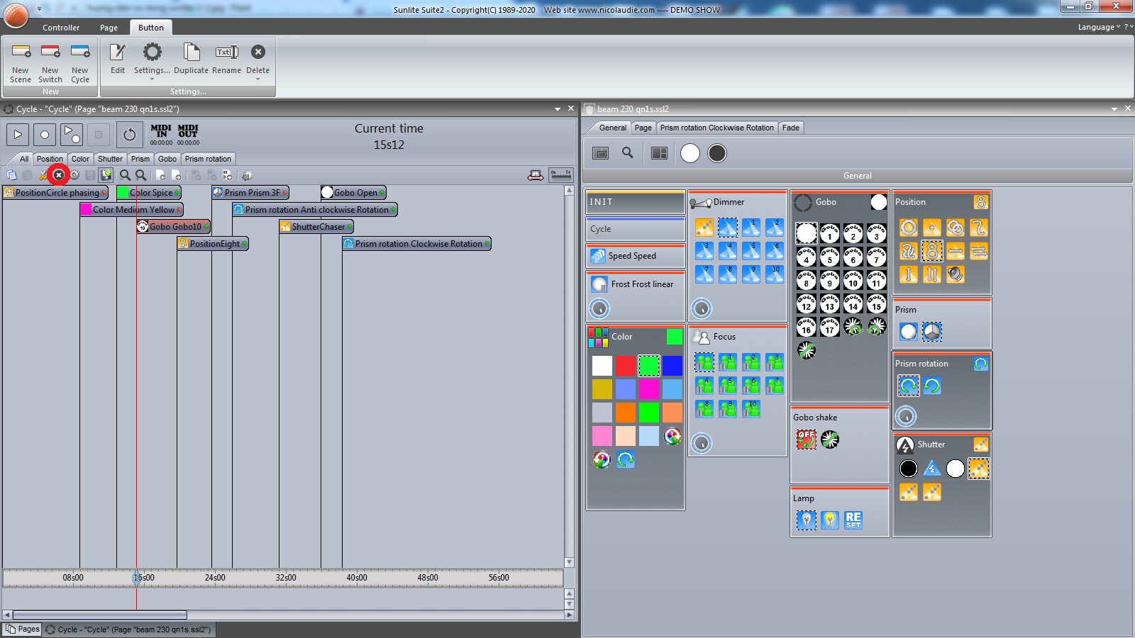 Sau khi ấn vào biểu tượng ghi lại chương trình. Ta lựa chọn bất kỳ một cảnh đèn nào (có thể là cảnh có sẵn hoặc cảnh tự viết trên Card bằng cách kích chuột trái 1 lần vào. Nó sẽ tự động được đưa vào trong Bảng. Thời gian chạy của Cảnh này là do ta tính toán cho hợp lý. Ví dụ ở đây mình chọn 1 cảnh có sẵn trên Sunlite 2 ở mục Position. Sau khi lựa chọn cảnh vào trong Cycle, ta có thể add bất kỳ giá trị nào cho cảnh đèn này như add gobo, màu sắc, nhân hoa, chạy đuổi...trên đèn moving Beam. Việc tính toán để đưa vào một hiệu ứng nào đó cũng nên làm khi mình xác định sẵn sân khấu của mình nó sẽ như thế nào trong khoảng thời gian đó. Nhờ vậy có thể làm chính xác được những trạng thái ánh sáng phù hợp với hiệu ứng âm thanh trên sân khấu.