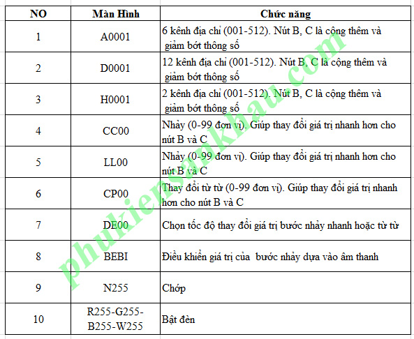 Ấn nút A, màn hình sẽ hiện lên 8 hiệu ứng khác nhau. Từ 1 tới 2 là dành cho các chức năng cơ bản. Từ 2 trở đi là dành cho các địa chỉ DMX cơ bản hay tốc độ. Người dùng có thể thay đổi các giá trị dựa vào nút B và C. Nút D dùng khi muốn cài đặt một thông số nào đó cho thiết bị.