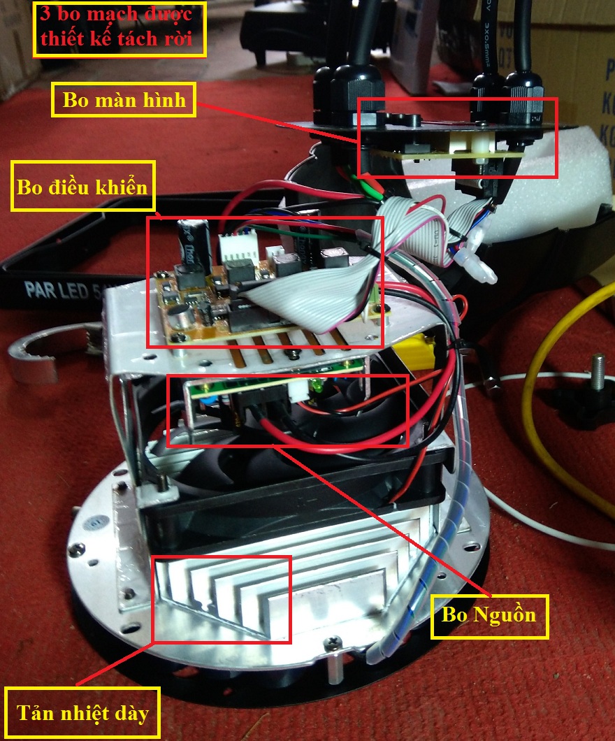 Đèn par led 54x9 QNS có ba bo mạch riêng biệt và tản nhiệt bóng rất dày.