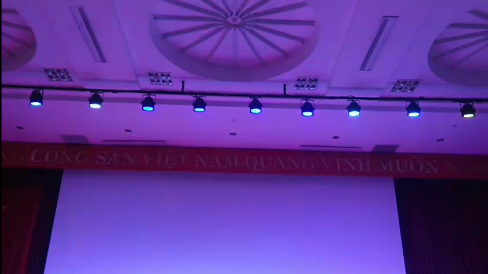 Hệ thống Led 54x9 được lắp tại cột xà ngang phía trên sân khấu và 2 chân đèn 2 tầng tại phía 2 bên cột của Hội Trường. Bàn điều khiển được khuyến nghị sử dụng là KingKong 256A và Card Sunlite 2 kết hợp với 1 chia tín hiệu DMX, toàn bộ hệ thống dây điện và dây tín hiệu đi ẩn hết vào trong...